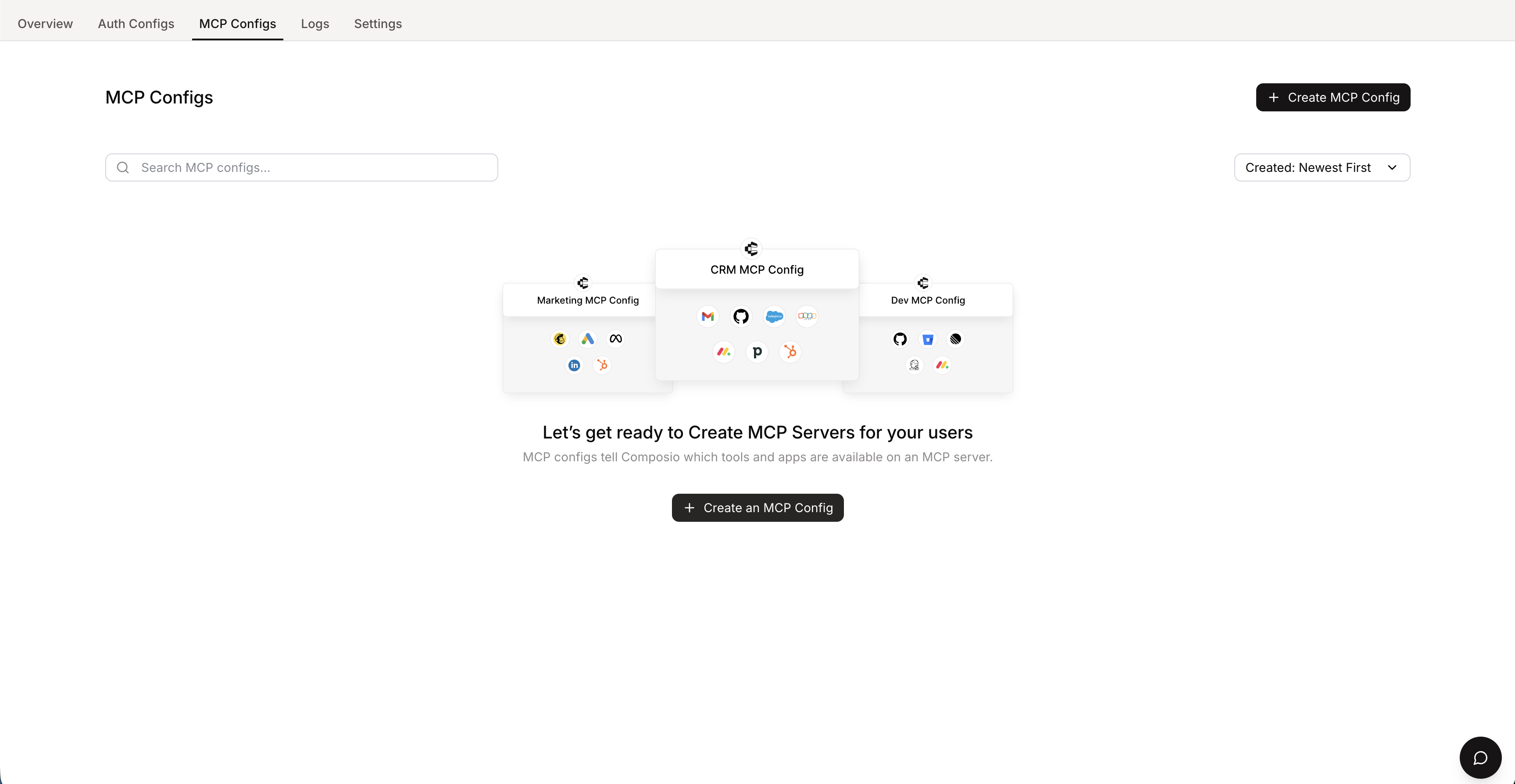 After creating a new organization and then a new project, navigate to the MCP configurations section and create configs for the MCP servers you want to use.
